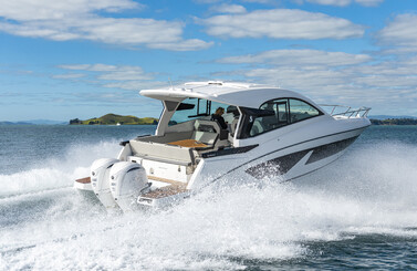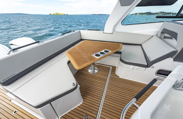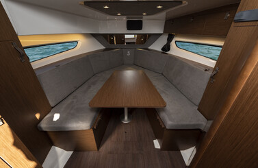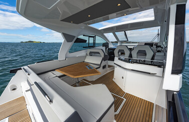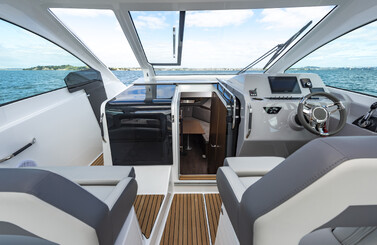 In the cockpit, the full beam layout of the Gran Turismo 32 allows for the best use of space. The back rest of the lounger seat and the aft bench tip back to create a large sunbathing area. To the bow, a safe and easy access thanks to the semi-walkaround leads to the sunbath for 3 people.