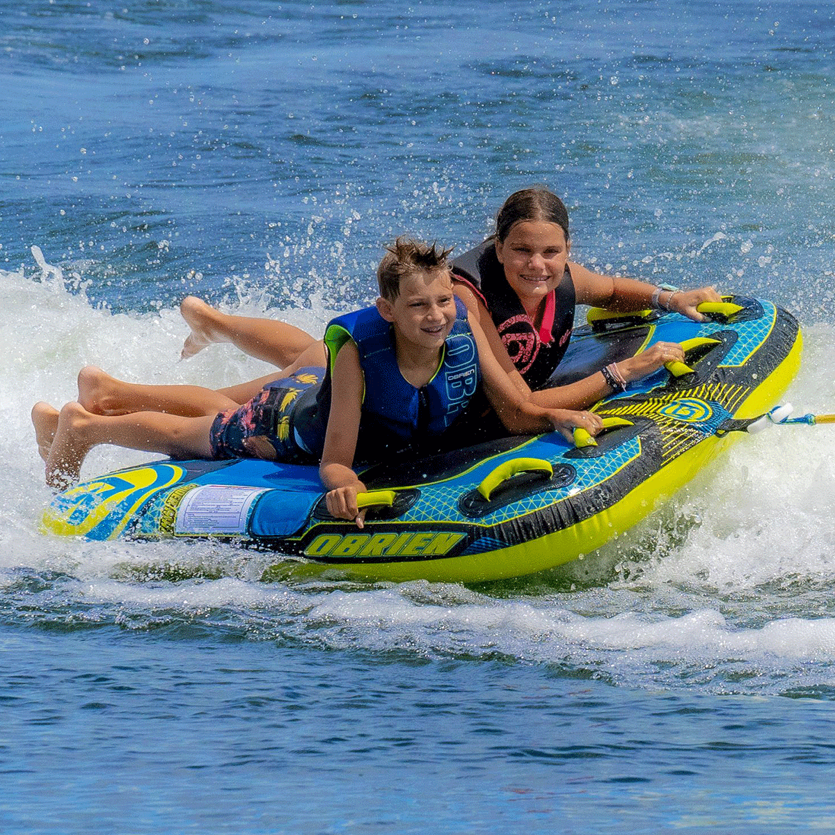 Grab a mate and hold on for dear life. Designed for up to two riders, the O'Brien Speedster 2-Person Inflatable Towable Ski Tube lets you share the thrills of a wild and bumpy ride. Its 26-gauge bladder is fully encased in robust 420 D nylon, ensuring strength and long-lasting performance. 6 soft handles provide a sure and comfortable grip. The EVA pad offers superior comfort even during the most exhilarating rides.