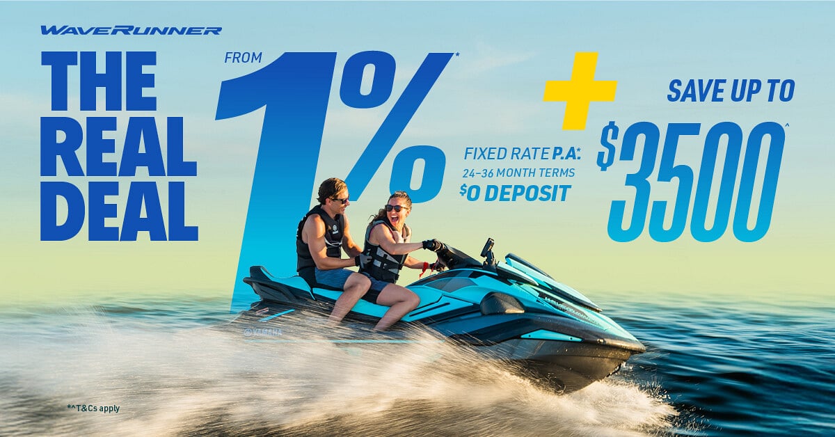 Terms and conditions apply: All prices stated above are GST inclusive. Promotion available between 01/08/24 to 31/05/25 on new and eligible MY23 WaveRunners through participating authorised Yamaha WaveRunner dealers, while stocks last. $3,500 (including GST) off RRP saving is applicable to eligible new MY23 FX LTD SVHO, FX CR SVHO, FX CR HO, GP1800R SVHO WaveRunners. $3,000 (including GST) off RRP saving is applicable to eligible new MY23, VX DELUXE, JETBLASTER, MY22 & 23 SUPERJET WaveRunners. $2,000 (including GST) off RRP saving is applicable to eligible new MY23, FX HO and MY24 JetBlaster. $1,500 (including GST) off RRP saving is applicable to eligible new MY24, FX SVHO. $1,000 (including GST) off RRP saving is applicable to eligible new MY24, FX CR HO and MY24 FX HO. Offer available for private buyers only on specified models and where warranty is registered on or before the 31/01/25. See your participating authorised Yamaha WaveRunner dealership for details. Discount savings must be redeemed at the dealership and must be used in one transaction at time of eligible purchase. Yamaha Motor New Zealand Ltd NZBN: 9429040177113. *Finance disclaimer: Fixed rate of 1% p.a. on a loan term of 24 or 36 months, 3.99% p.a. on a loan term of 48 months, 4.99% p.a. on a loan term of 60 months on Yamaha Motor Finance New Zealand Ltd’s (YMFNZ) Consumer contract standard terms and conditions to approved applicants. The offer is available for private buyers only on the specified models above. Credit criteria, fees, charges and conditions apply including an application fee of $325, $8.05 PPSR fee, and a dealer administration fee may be applicable. Finance is provided by YMFNZ NZBN 9429036270798, FSP 9622.